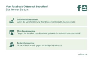 Bei einem Vorgehen gegen das soziale Netzwerk legen wir bei rightmart Wert auf einen ganzheitlichen Ansatz. Dieser beinhaltet nicht nur die Geltendmachung von Schadensersatzansprüchen, sondern ebenso einen Unterlassungsantrag. „Mithilfe eines Unterlassungsantrags kann Facebook gerichtlich dazu gezwungen werden, aktuell geltende Sicherheitsstandards zu erfüllen, um den vorgeschriebenen Schutz von Daten zu gewährleisten“, sagt Strasmann. Noch wichtiger ist allerdings die künftige Absicherung. Sprich: Daten, die im Zuge des Facebook-Datenlecks gestohlen wurden, müssen nicht zwingend in naher Zukunft Schaden anrichten. „Cyber-Kriminelle können auch zu einem viel späteren Zeitpunkt noch versuchen, mithilfe der gestohlenen Daten betrügerische Absichten zu verfolgen. Wir sichern unsere Mandant:innen in Form eines Feststellungsantrags so ab, dass ihnen auch zukünftige Schäden durch Facebook ersetzt werden müssen.“
