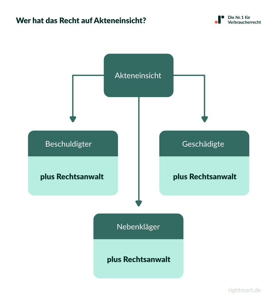 Ebenso gewährt die Strafprozessordnung (StPO) Nebenkläger:innen bzw. ihren Anwälten Akteneinsicht. Die kann allerdings mit Einschränkungen einhergehen. Treten Sie als Nebenkläger:in auf, kann ein Antrag auf Einsicht in die Ermittlungsakte untersagt werden, sofern sich dadurch Nachteile für die oder den Beschuldigte:n ergeben können. Das ist beispielsweise der Fall, wenn davon auszugehen ist, dass Sie durch die Wissensstände aus der Akte beeinflusst werden.